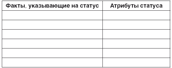 Вы должны заполнить таблицу не менее чем на 4 пункта. Обозначьте признаки формального статуса, а также атрибуты, которые могут свидетельствовать о таковом, в том числе тогда, когда человек им в реальности не обладает. Точнее, он пытается выдавать свой мнимый статус за подлинный.