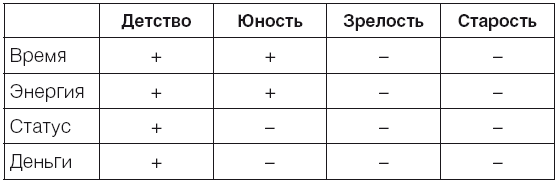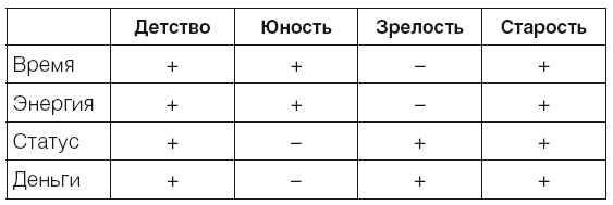 Составим таблицу «4 ценности»: время, деньги, статус и энергия. Суть скрипта – распределение этих ценностей в разные периоды жизни (детство, юность, зрелость и старость) и закономерные последствия этого.