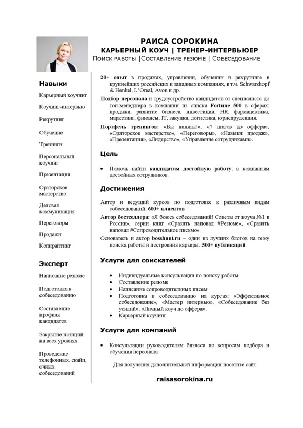 Рекомендуем воспользоваться советами одного из самых авторитетных специалистов в сфере поиска работы и эксперта по резюме Раисы Сорокиной.