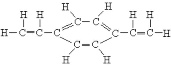 В дивинилбензоле две двойные винильные связи. В ходе полимеризации они образуют трехмерную сетчатую структуру. При нагревании полученный полимер медленно разлагается.