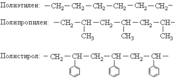 С точки зрения химического поведения полимер похож на мономер (или мономеры), из которого (или которых) он получен. Углеводороды этилен H2C=CH2, пропилен H2C=CH—CH3 и стирол H2C=CH—C6H5 претерпевают присоединительную полимеризацию, образуя полиэтилен, полипропилен и полистирол со следующими структурами:
