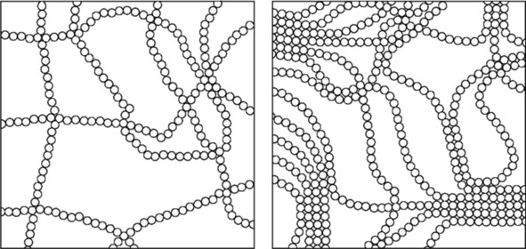в сильной мере зависят от расположения мономерных звеньев в полимерных цепях, поскольку полимеры могут кристаллизоваться, если цепи имеют регулярное строение и расположены параллельно друг другу, что достигается процессом, называемым ориентационным вытягиванием с отжигом. Чем выше степень кристалличности, тем тверже продукт, тем выше его температура размягчения и больше устойчивость к набуханию и растворению; низкой степенью кристалличности характеризуются более мягкие продукты с более низкими температурами тепловой деформации и более легкой растворимостью (рис. 2).