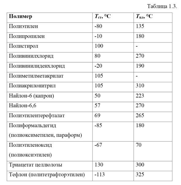 В табл. 1 показаны критические температуры Tст и Tпл ряда важных промышленных термопластов. Все реактопласты после того, как произошла сшивка цепей, становятся твердыми и жесткими. Температура стеклования tст и температура плавления tпл некоторых пластических полимерных материалов.