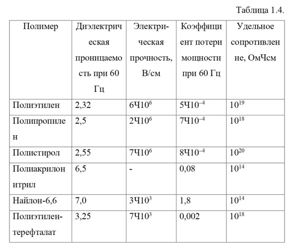 Свойства пластмасс зависят от их основных характеристик: а) природы мономеров; б) средней СП; в) степени кристалличности системы. Электрические свойства некоторых промышленных пластмасс.