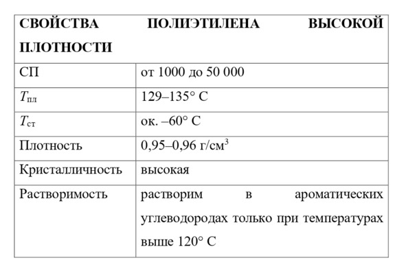 Линейные полиэтилены образуют области кристалличности (рис. 2), которые сильно влияют на физические свойства образцов. Этот тип полиэтилена (см. таблицу) обычно называют полиэтиленом высокой плотности; он представляет собой очень твердый, прочный и жесткий термопласт, широко применяемый для литьевого и выдувного формования (см. ниже) емкостей, используемых в домашнем хозяйстве и промышленности. Полиэтилен высокой плотности прочнее полиэтилена низкой плотности.