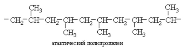В атактическом полипропилене беспорядочное расположение метильных групп препятствует кристаллизации, в результате получается мягкий, резиноподобный материал, который легко растворим в органических растворителях и размягчается при невысоких температурах. Он используется для получения различных изделий методом экструзии, а также в качестве клея для пластмасс.