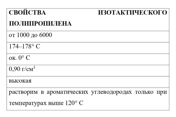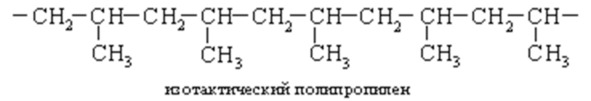 В тактическом полипропилене метильные группы расположены регулярно вдоль цепи. Вследствие этого из тактического полипропилена получаются прочные жесткие термопласты с высокими температурами плавления и отличной устойчивостью к растворителям. Изотактический полипропилен – важный промышленный продукт. Он широко используется для получения волокон и пленок и как материал для литьевого и выдувного формования емкостей.
