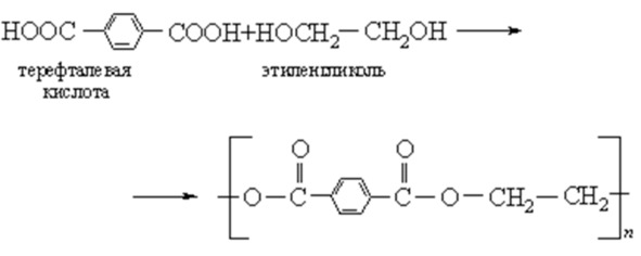 получают из органических кислот и спиртов, обычно полифункциональных мономеров; линейные полиэфиры – из двухосновных кислот и гликолей. Наиболее важный линейный полиэфир – полиэтилентерефталат (или полиэтиленгликольтерефталат) с высокой СП – получается по реакции терефталевой кислоты с этиленгликолем в присутствии катализатора при повышенной температуре в вакууме: