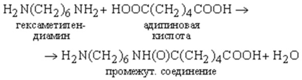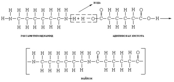 Например, гексаметилендиамин H2N (CH2) 6NH2 имеет две аминогруппы NH2, поэтому его называют диамином. Адипиновая кислота HOOC (CH2) 4COOH имеет две карбоксильные группы COOH, поэтому ее называют дикарбоновой или двухосновной кислотой. В реакции поликонденсации, типичной для всех диаминов и двухосновных кислот, гексаметилендиамин и адипиновая кислота, отщепляя воду, образуют цепь: