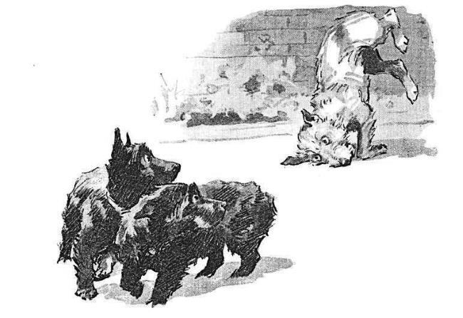 Один раз раздались писки-визги363, и Ящик-с-Оборками364, с ногами под ним, подошёл к месту-у-гаража365. Там был пёс, такой, как я и Слипперс, в оборчатом воротнике. Множество Малышей тянулись за ним хвостом. Мы сказали Самому Маленькому. Он тут же подошёл к окну. Он сказал: