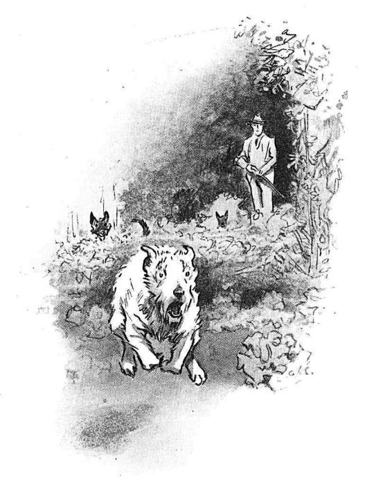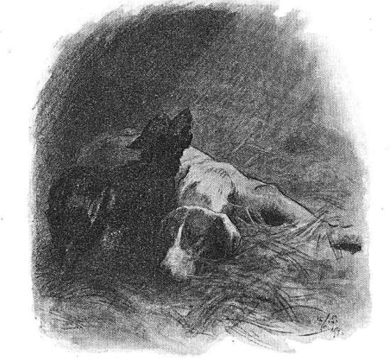 Рэведжер ничего ей не сказал. Она ушла, чтобы рассказать. Я сел рядом на случай, если он проснётся. Вскоре пришли все-Люди: Самый Маленький, Хозяин-с-Хозяйкой и Гарри-с-Лопатой. Слипперс тоже: он оставался со своим Самым Маленьким и целовал ему руки, чтобы сделать его счастливым-щенком. Они пошли в Сад. Гарри выкопал яму и зарыл его, как кость. Но это был мой Рэведжер. Самый Маленький говорил жутко громко, и они ушли-все-все-кроме моей Эдар, которая сидела на тачке и икала. Я попытался откопать. Она подняла меня, отнесла на кухню, крепко обняла, накинув фартук на голову, и громко засмеялась. Мне не позволили бы мне копать снова. Меня привязали. Через какое-то время я отправился на Аллею на случай, если, может, смогу его найти. Я направился к его ложу в папоротнике. Я отправился на Аллею, на Лесную Дорожку, на Мышиное-поле и по всем прежним местам. Его там не было. Поэтому я вернулся и стал ждать в Саду, где нашёл в ту ночь ослепшим того, кто был моим верным другом Рэведжером, который всегда был добр ко мне с тех пор, как мы были почти щенками, и никогда не обращал внимания на мои короткие лапы или на то, что я был дурашкой. Но он не пришёл…