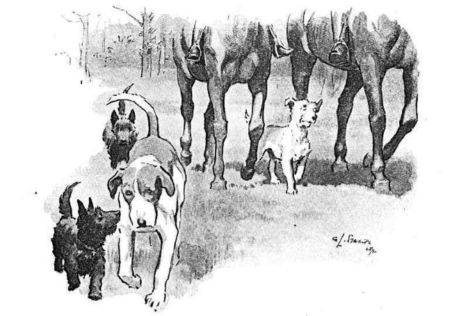 Так и было сделано. Пёс Тоби болтал с Джеймсом о крысах, когда не ездил кататься с Самым Маленьким и с нами. Однажды Мур заставил этого-шалопая-конюха проложить след389, чтобы приучить Тэффи к прыжкам и канавам при охоте на лисят. Это были известные мне хвосты-селёдки-из-мусорного-бака. Рэведжер сказал, что след был вонючей-дрянью-из-горшка, и отправился домой. (Со мной). И Пёс Тоби пришёл. Раз за разом Самый Маленький выводил его на лужайку и говорил:
