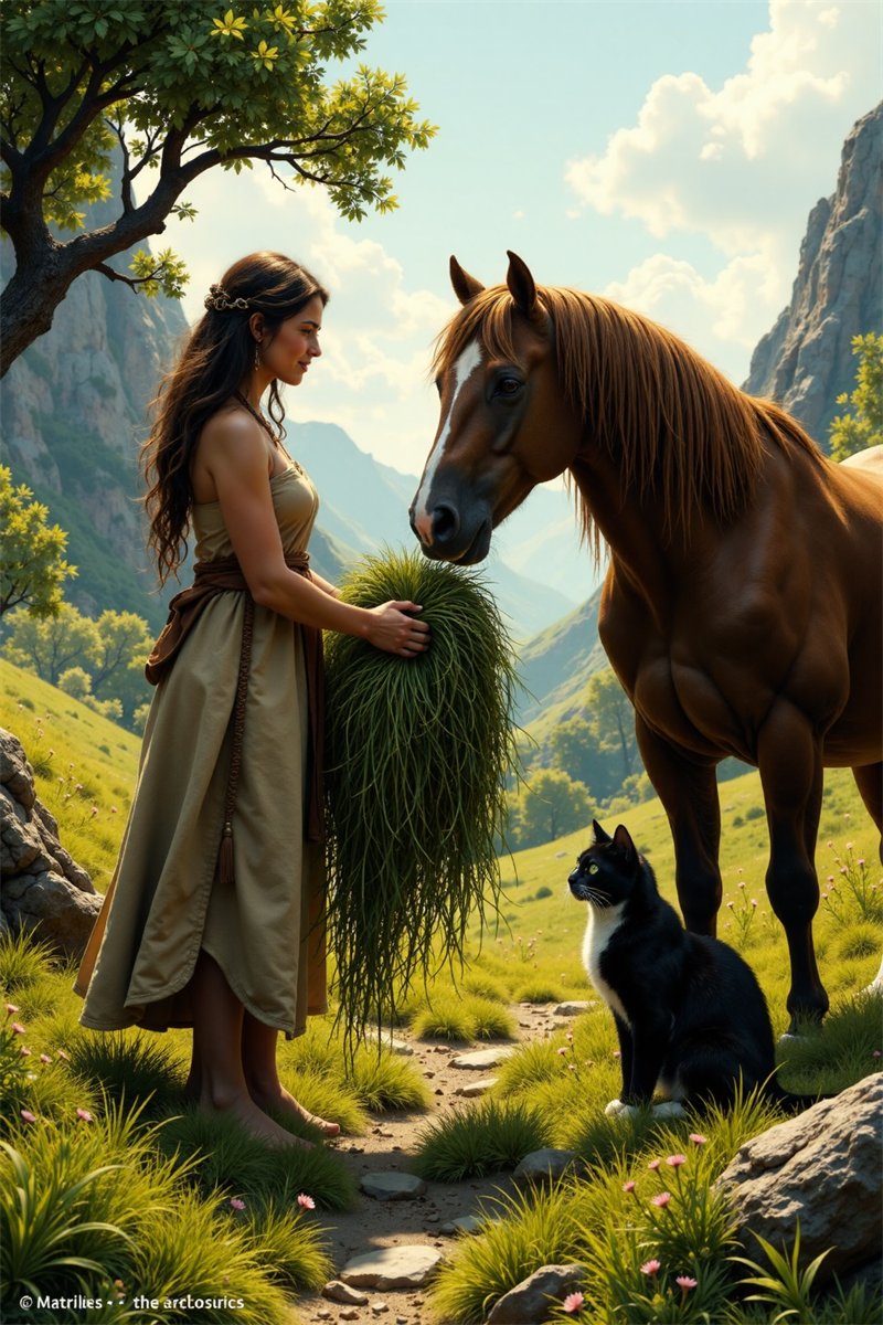«Так, – сказал кот, прислушиваясь, – какая же умная Женщина, но я все же умнее». Дикий Конь склонил свою дикую голову, и Женщина одела на нее плетеный кожаный повод. Теплое дыхание Дикого Коня коснулось ног Женщины, и он сказал: «О, моя Хозяйка и Жена моего Хозяина, я буду твоим слугой ради чудесной травы».