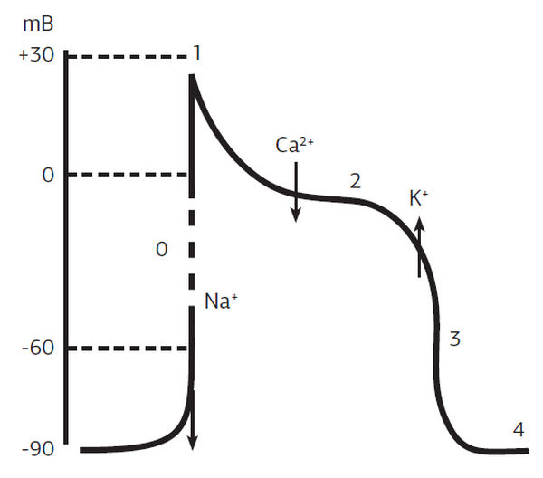 Мышечные клетки сердца (кардиомиоциты) в ответ на действие раздражителей (электрической или гуморальной природы) способны отвечать возбуждением, проявляющимся генерацией потенциала действия на поверхности их мембраны. В потенциале действия различают следующие фазы.