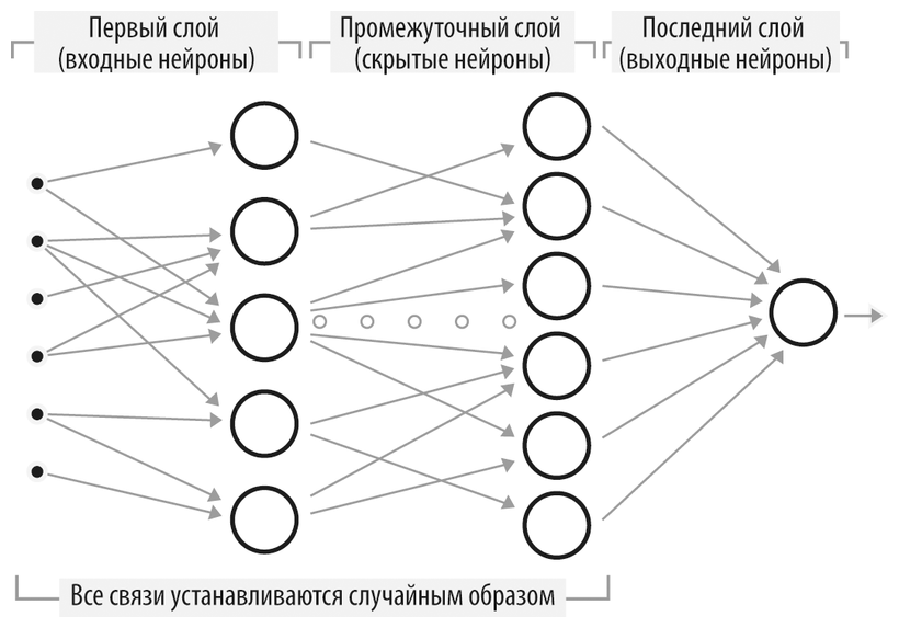 – Создается Ni нейронов (где i – номер слоя). Входящие соединения каждого из них связываются с исходящими соединениями нейронов в предыдущем слое (см. также раздел «Вариации»).