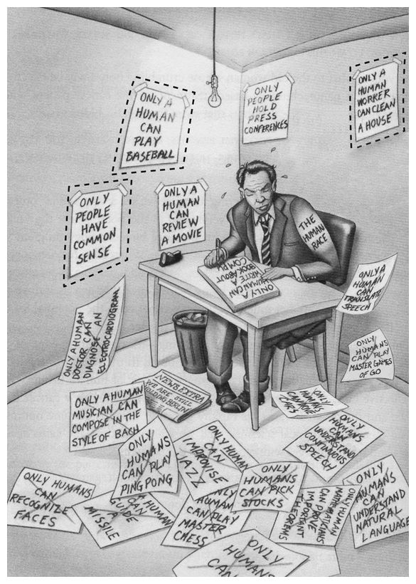 На этом рисунке представлены задачи, с которыми искусственному интеллекту еще предстоит справиться. Листки на полу символизируют уже освоенные ИИ навыки, а над теми, что пока висят на стене, очерченные пунктирными линиями, ведется активная работа. (Только человек может играть в бейсбол. Только у людей есть здравый смысл. Только человек может написать рецензию на фильм. Только люди проводят пресс-конференции. Только человек может навести порядок в доме. Человеческая раса. Только человек может написать книгу о компьютере. Только человек может переводить речь. Только люди могут мастерски играть в го. Только человек может поставить диагноз по ЭКГ. Прочие новости Мы все еще удерживаем Берлин. Только человек может сочинять музыку, подражая Баху. Только люди могут играть в настольный теннис. Только люди могут узнавать лица. Человек может управлять ракетой. Только люди могут импровизировать в джазе. Только люди могут мастерски играть в шахматы. Только люди могут инвестировать. Только человек может водить машину. Только люди могут понимать непрерывную речь. Только люди могут понимать естественный язык. Только люди могут доказать важные теоремы. Только люди могут…)
