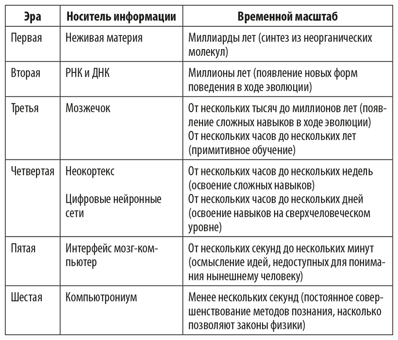 К чему это приведет, мы обсудили в предыдущей главе, когда говорили о шести информационных эрах. В таблице «Смена парадигм обработки информации в процессе эволюции» кратко изложены основные моменты.
