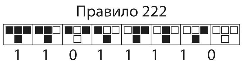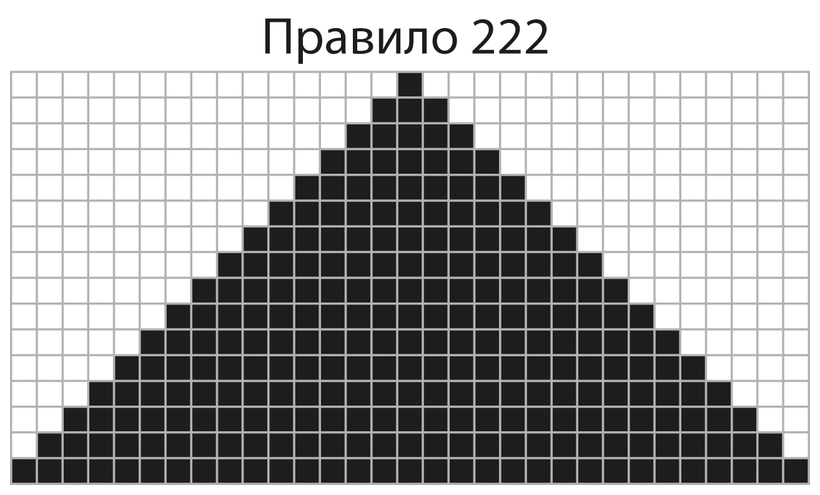 Очевидно, что правило 222 порождает очень предсказуемый рисунок. Если вас спросят, какой будет центральная ячейка после миллиона итераций (или даже после миллиона в миллионной степени), вы не задумываясь ответите: черной. Именно так обычно воспринимается «настоящая» наука: как использование непреложных законов для получения предсказуемых результатов.