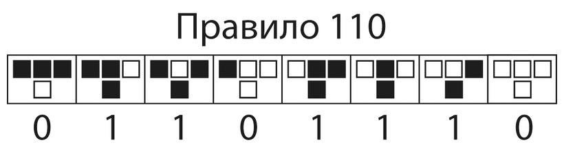 Существуют восемь возможных состояний ячейки и ее соседей на определенном шаге. Они представлены в верхнем ряду. Правила определяют, какой цвет в зависимости от исходного состояния примет центральная ячейка в следующем поколении (результат изображен в нижнем ряду). Черный и белый цвета можно для удобства обозначить как 1 и 0 соответственно.