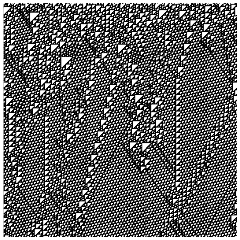 Если мы создадим автомат по этому правилу, начиная с одной черной клетки, то через множество поколений он будет выглядеть следующим образом: