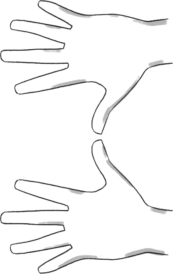 Перечитайте списки. Захотелось бы вам сделать усилие, чтобы сегодня оказаться в одном из приближающих состояний? Если это так, пожалуйста, напишите, что именно вы бы сделали, на левой ладони, которая изображена на следующей странице. А если вы в отдаляющем состоянии, хотелось бы вам ощутить дискомфорт и позволить ему стать вашим проводником? Если вы ответили положительно, пожалуйста, запишите это на правой ладони.