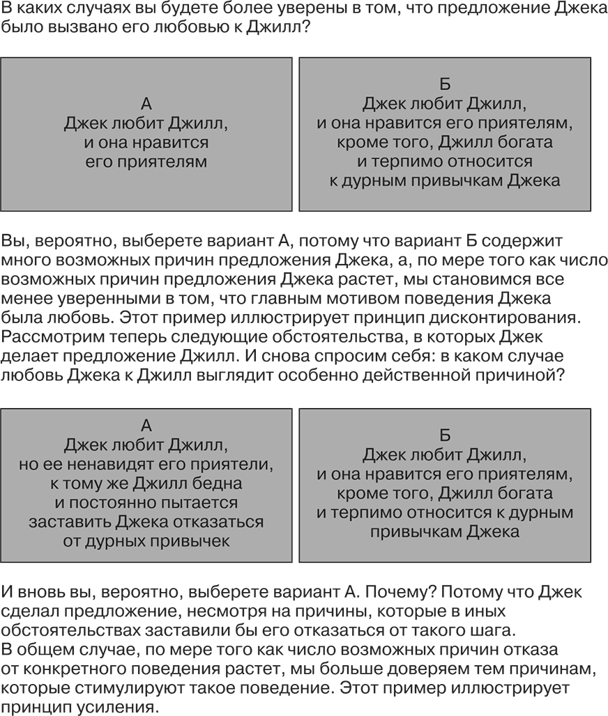 Если мы делаем вывод о том, что поведение было преднамеренным, а его последствия можно было предвидеть, то есть если мы решаем, что Джек сделал предложение Джилл, зная, что она воспримет его слова серьезно, мы должны будем затем выяснить, было ли поведение Джека результатом свободного выбора. Например, если Джека заставил сделать предложение вооруженный брат Джилл, то мы вряд ли решим, что предложение было вызвано глубоким чувством Джека к этой девушке. Только то поведение, которое осуществляется добровольно, отражает намерения, согласующиеся с поведением. Однако даже если мы установим, что Джек сделал предложение Джилл добровольно и с осознанием последствий этого шага (например, рассчитывал, что она услышит его и ответит согласием), мы все равно не сможем знать наверняка, соответствовало ли предложение каким-то внутренним качествам Джека или оно было обусловлено какими-то аспектами ситуации. Такой анализ оказывается более сложным, так как здесь могут быть многочисленные возможности в каждой из этих категорий. Например, возможно, что Джилл действительно нравится многим приятелям Джека; возможно, она живет в роскошном особняке или является единственной известной Джеку женщиной, способной терпеть его малоприятные привычки. Такой широкий набор альтернатив затрудняет выбор какой-то одной из них. Вполне вероятно, что предложение Джека было вызвано его любовью к Джилл, но, возможно, и нет. В таких обстоятельствах наше нежелание делать ставку только на объяснение поведения Джека его любовью к Джилл вытекает из принципа дисконтирования: по мере того как число возможных причин увеличивается, мы становимся менее уверенными в том, что какая-то конкретная причина является правильной (Kelley, 1973; Oppenheimer, 2004).