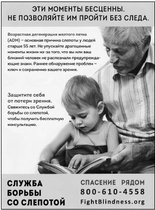 Составители данного объявления для благотворительного фонда, который занимается праведным делом – финансирует исследования возрастной дегенерации желтого пятна, – поступили мудро, стремясь повысить щедрость пострадавших спонсоров, предоставляя бесплатную информацию о том, как справиться с расстройством (взаимность), и изображая моменты, которые нельзя упускать (неприятие потерь).