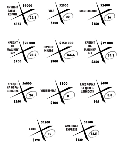 Составьте полный список всех своих долгов. Включите в него задолженность по кредитным картам, займы на образование, кредит на машину, на яхту, долговые расписки друзьям и родственникам, магазинные кредиты, ипотеку на загородный дом и личное жилье. Не включайте долги, используемые для инвестиций, такие как ипотека на недвижимость, предназначенную для сдачи внаем, и инвестиции в бизнес. Напоминаю еще раз: ваш дом не является инвестицией. Мы имеем дело только с плохими долгами, за которые платите вы сами. За хороший долг платит кто-то другой, например жильцы, арендующие вашу недвижимость.