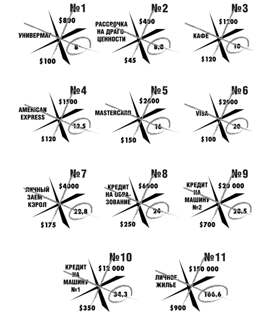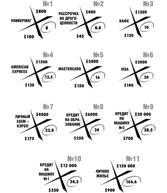 Меня часто спрашивают: «Разве не нужно в первую очередь погашать долги с самыми высокими процентными ставками?» Не нужно, если вы хотите, чтобы данная формула работала. Дело в том, что в этом процессе очень важно увидеть немедленные результаты. В противном случае можно впасть в отчаяние и опустить руки еще до того, как вы успеете погасить хотя бы один из своих долгов. Следуя же нашей формуле, вы погашаете долг, от которого можно быстрее всего избавиться. Поэтому вы скорее увидите результаты и убедитесь в том, что ваши усилия не напрасны. Добившись явного прогресса, вам будет легче двигаться дальше.