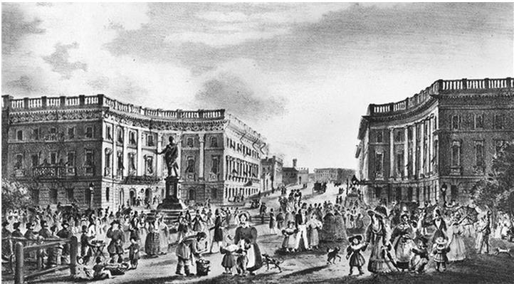 С расширением Одессы и притоком населения также усилилось желание наслаждаться удовольствиями изысканного общества. Временный театр, в котором проходили представления на русском, польском и немецком языках, возник почти сразу, но несколько лет назад он был перестроен в элегантный каменный театр по плану Ж.-Ф. Томона[94]94
