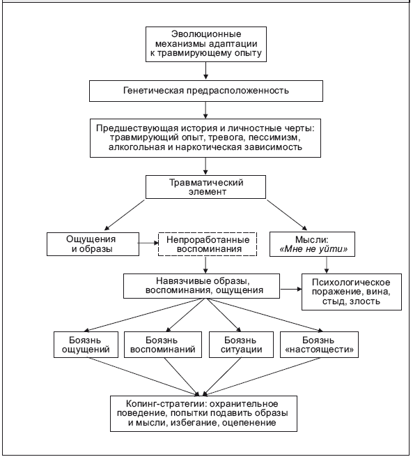 Понять, как формируется ПТСР, можно, внимательно рассмотрев схему 9.1. Существуют определенные факторы предрасположенности: генетика, семейная история, предшествующий травматический опыт, навыки решения проблем, наличие или отсутствие «группы поддержки», чувствительность к тревоге, предшествующие травме психологические проблемы и т. д. На эти факторы накладываются последствия самого травматического события. К травматическим относятся любые события, угрожавшие вашей (или чьей-либо еще) жизни или вашему человеческому достоинству (например, пытки или изнасилование).
