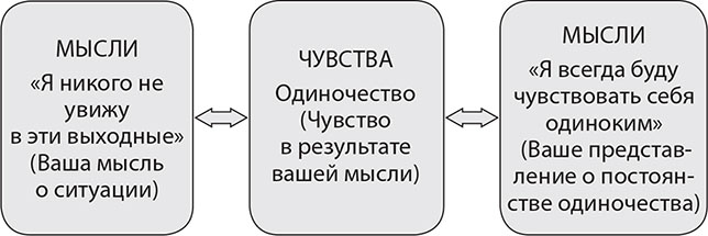 Мысли не противоположны чувствам – они отличны от них. Мысль («Я неудачник») может привести к чувству (грусти), и это чувство, в свою очередь, может привести к новой мысли («Я всегда буду один»).