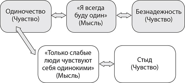 Помните, я упоминал о том, что мы также можем испытывать чувства по поводу мыслей и чувства в результате чувств? Например, мы можем почувствовать себя одиноко, потом подумать, что всегда будем оставаться одни, а потом – решить, что наше одиночество продлится вечно. Другими словами, мы можем думать об эмоции одиночества следующим образом: «Мое одиночество – это навсегда», или «Другие люди не чувствуют себя такими одинокими», или «Мое одиночество вышло из-под контроля», или «Я слабый человек, потому что чувствую себя одиноким». На рис. 1.2 можно увидеть, каким образом такие мысли о чувствах приводят к новым чувствам, которые могут оказаться еще тревожнее – и привести нас к ощущению полной безнадежности из-за своего одиночества.