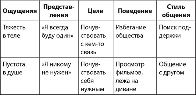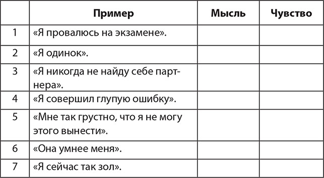 [Закрыть], ревность и негодование. Мы часто путаем эмоции с мыслями. Однако мысли обычно представляют собой утверждения или представления о фактах («Он неудачник»), в то время как эмоции, как правило, являются чувствами, которые мы испытываем по поводу этой мысли (например, раздражительность). Так, вы думаете о чем-то как о безнадежной затее (это своего рода предсказание будущего), но на самом деле не ощущаете безнадежности (поскольку вам нет до этого никакого дела). Вы можете думать, что ваш бывший партнер с кем-то встречается, но не чувствовать ревности, потому что уже порвали с ним. Или, например, вы думаете, что проведете все выходные в одиночестве, но при этом не чувствуете себя одинокими.