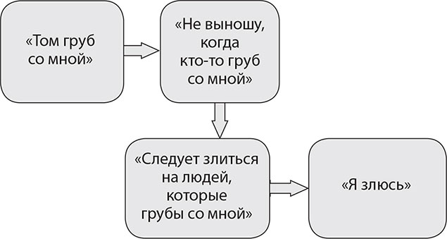 Возьмем другой пример. «Том был груб со мной» – это мысль, причем мысль об эмоции, которая, по вашему мнению, присуща Тому. Возможно, он и в самом деле был с вами груб. А может быть, и нет. Не исключено, что у него просто болела голова. Однако даже если вы действительно думаете, что он был груб, вам может быть наплевать на это (эмоция). Ваша мысль о грубости Тома не означает автоматического чувства гнева на него. Грубость Тома должна иметь значение для вас — иными словами, она должна вас волновать. Чтобы испытать эмоцию, нужно придать его поведению значение. Поэтому может оказаться, что вас посетит еще одна мысль, которая и придаст искомое значение грубости, проявленной Томом: «Не выношу, когда кто-то груб со мной» или «Следует злиться на людей, которые грубы со мной». Такие мысли вполне способны вызвать в вас гнев или тревогу.