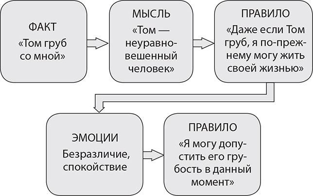 Итак, мы видим, что факт (Том груб) и мысль («Не выношу, когда он груб») могут вызвать эмоцию. Но факты и мысли не всегда вызывают одну и ту же эмоцию. Ведь может существовать и другая мысль – правило, из-за которого факт и мысль становятся для вас проблемой. И это правило гласит: «Терпеть не могу всякий раз, когда Том бывает груб со мной» или «Я не могу смириться с его грубостью».