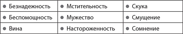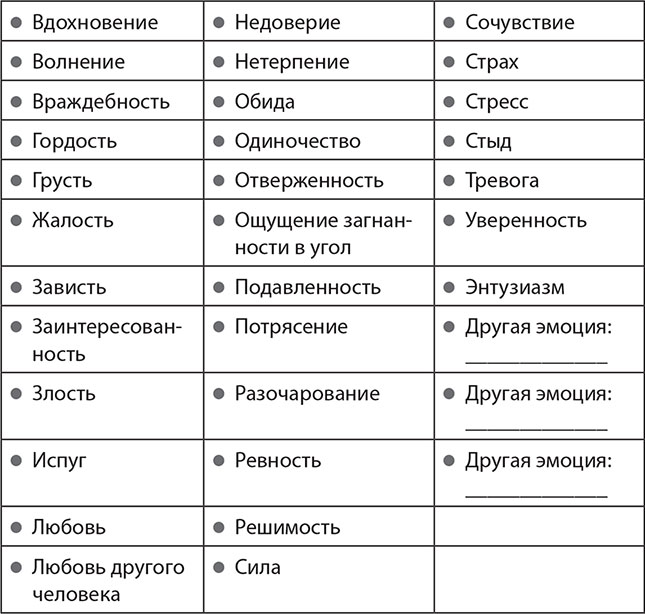Эмоции присущи всем нам, но некоторым людям трудно их замечать, распознавать и запоминать. В большинстве случаев эмоции кажутся настолько автоматически возникающими и быстротечными, что нам удается заметить и определить их лишь спустя некоторое время. Давайте проверим, можете ли вы вспомнить, когда вам довелось испытать перечисленные в следующем упражнении эмоции. Переживали ли вы какие-либо из них в последнее время? А может быть, испытываете постоянно?
