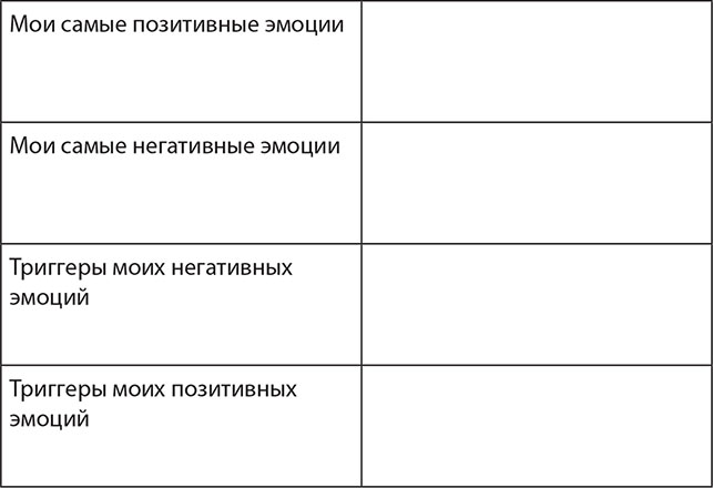 В следующем упражнении перечислите свои самые позитивные и самые негативные эмоции. К примеру, к числу позитивных вы можете отнести счастье, радость, заинтересованность, спокойствие и признательность; а негативных – гнев, тревогу, грусть и одиночество. Не забудьте перечислить триггеры – события, людей, мысли или ситуации, – запускающие эти эмоции.