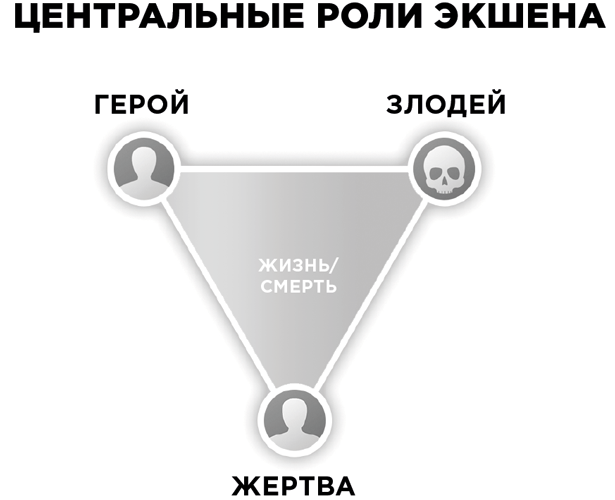 Центральные роли экшена – герой, злодей, жертва.