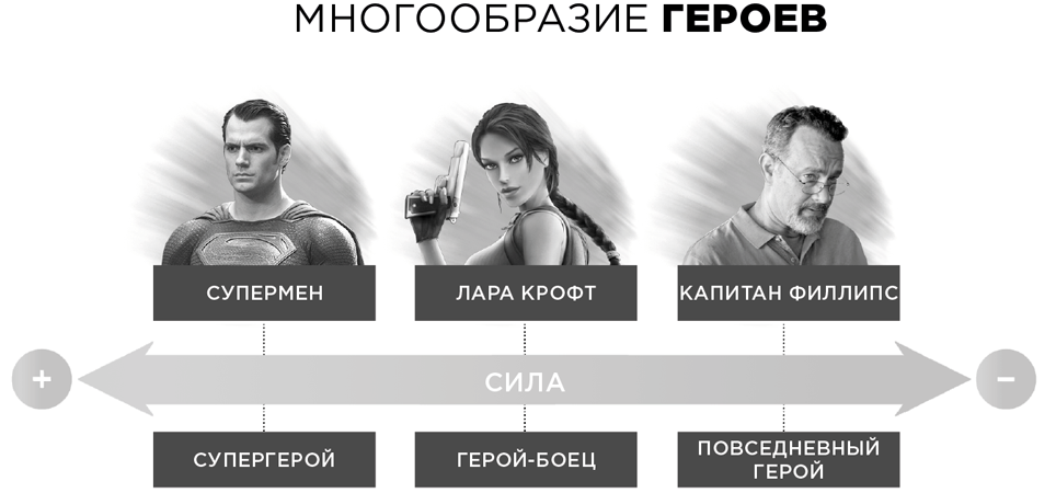 Оттенки героической силы выстраиваются в спектр от супергероя (Супермен) до героя-бойца (Лара Крофт) и простого, «повседневного» героя (капитан Филлипс). Супергерой применяет свои сверхчеловеческие способности, чтобы сражаться с бесчеловечными злодеями. Герой-боец испытывает свои силы в борьбе с обычными злодеями. У повседневного героя никаких особенных способностей, кроме воли и стойкости, нет.