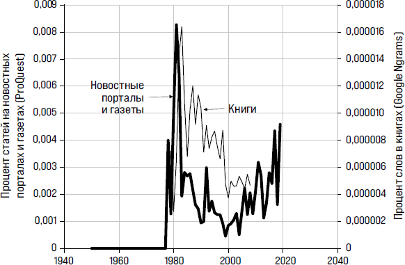 Источники: расчеты автора с использованием данных ProQuest News & Newspapers с 1950 по 2019 год, «Книги» (Google Ngrams) с 1950 по 2008 год, без выравнивания.