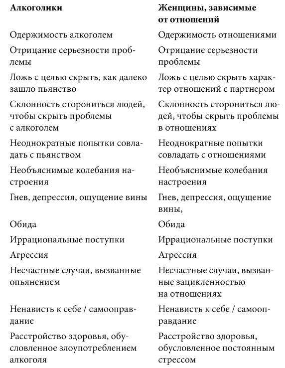Давайте попробуем рассмотреть модель слишком сильной любви, исходя из того принципа, что это болезнь. Это нелегкая задача. Если вы откажетесь принять это предложение, я все же надеюсь, что вы хотя бы усмотрите явную аналогию между болезнью, например, алкоголизмом, который является зависимостью от вещества, и тем, что происходит со слишком любящей женщиной, зависящей от своего партнера. Я совершенно убеждена: беда, постигшая слишком любящую женщину, – это не просто что-то похожее на болезнь, а самая настоящая болезнь, требующая конкретного диагноза и конкретного лечения.