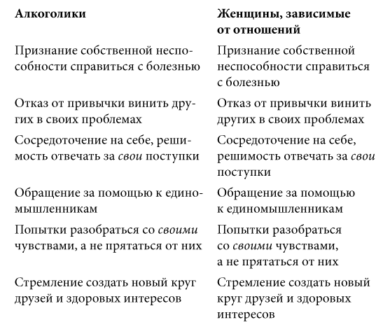 Одна психотерапия не может стать необходимой альтернативой зависимости алкоголика от спиртного или «зацикленной» на отношениях женщины от партнера. Когда любая жертва зависимости пытается остановиться, в ее жизни возникает колоссальный вакуум – слишком большой, чтобы его мог заполнить часовой сеанс психотерапевта один-два раза в неделю. Из-за сильнейшей тревоги, возникающей вместе с прекращением зависимости от конкретного вещества или человека, больной должен постоянно получать поддержку, ободрение и понимание. Лучше всего их могут дать единомышленники, которые сами прошли мучительный процесс отвыкания.
