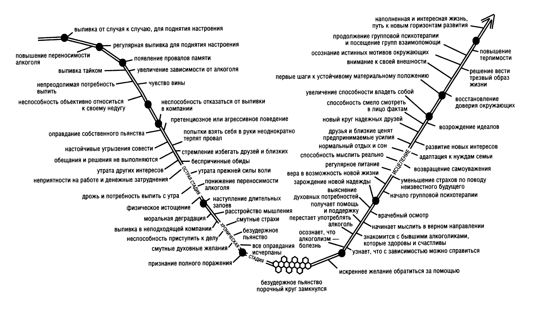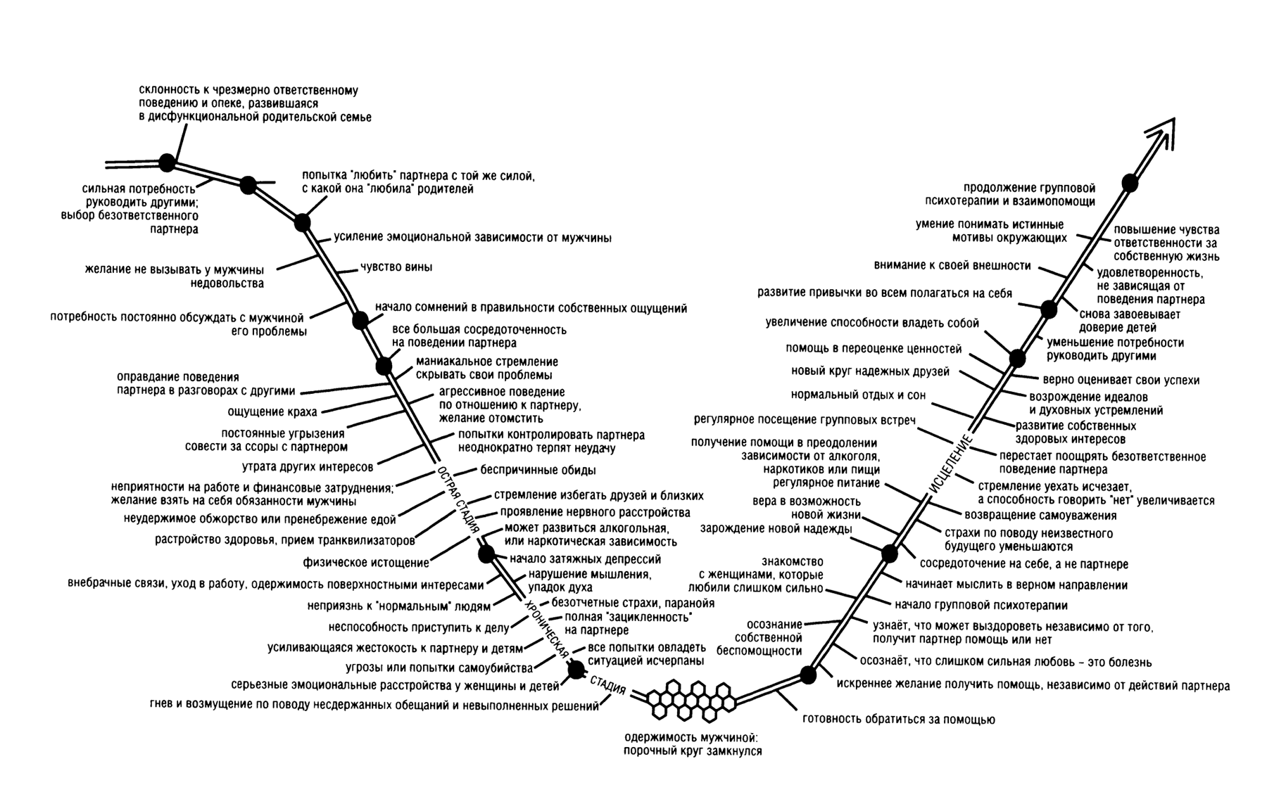 Из приведенных ниже графиков, показывающих симптомы развития болезни у алкоголиков и у женщин, страдающих зависимостью от отношений, а также особенности их исцеления, ясно видны параллели в поведении обоих как на активной стадии, так и в период выздоровления. К сожалению, график не может передать насколько похоже протекает борьба за исцеление у людей с этими заболеваниями. Справиться с зависимостью от отношений так же трудно, как и с алкоголизмом. А для тех, кто страдает любой из этих болезней, исцеление может быть делом жизни или смерти.
