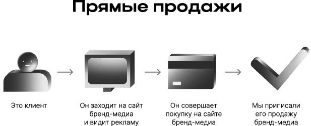 Прямые продажи. Самый простой способ. Читатель медиа видит баннер или врезку о товаре или услуге и совершает покупку. Мы отслеживаем действия этого человека с момента, когда он зашел на сайт или в соцсети, до того, как он сделал покупку. Продажу мы приписываем напрямую бренд-медиа.