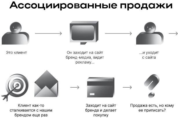 Ассоциированные продажи. Читатель медиа видит на нашем сайте рекламу товара или услуги, а затем уходит. Позже где-то в интернете или на улице он еще раз контактирует с брендом: получает рассылку, видит таргетированную рекламу или что-то еще. В результате любой из этих источников может подвигнуть клиента совершить покупку.