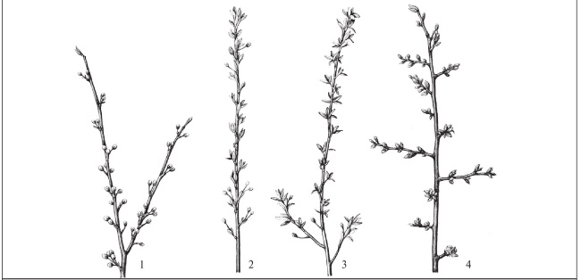 1 – на короткой – боковые почки генеративные; 2 – на средней – в нижней части одиночные генеративные, в средней – вегетативные, в верхней – групповые; 3 – на длинной – все почки вегетативные; из них образуются букетные веточки, шпорцы, короткие побеги (4).