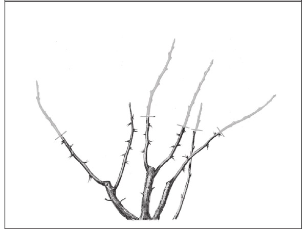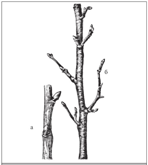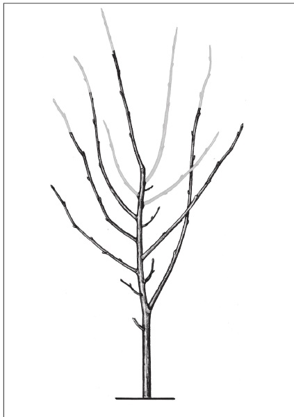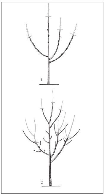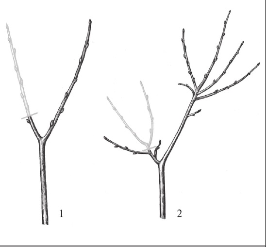 Чтобы вызвать ветвление, нулевые ветви укорачивают. Степень укорачивания определяется способностью сорта к побегообразованию. При очень плохой побегообразовательной способности ветвь укорачивают почти наполовину.