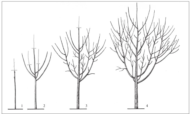 1 – обрезка однолетки; 2 – закладка ветвей первого яруса; 3, 4 – закладка последующих ветвей.