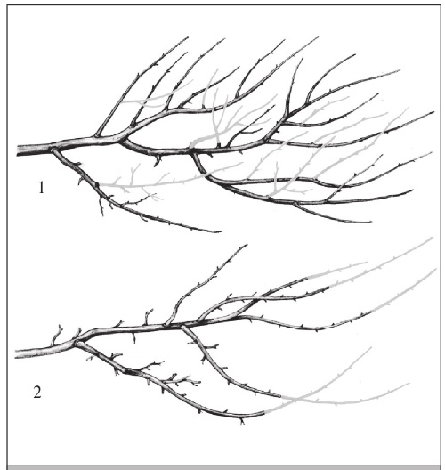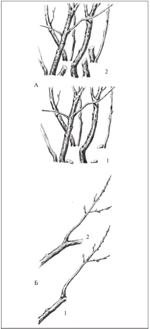 Рис. 315. Прореживания при сильном ветвлении (1); укорачивания для стимуляции ветвления (2).